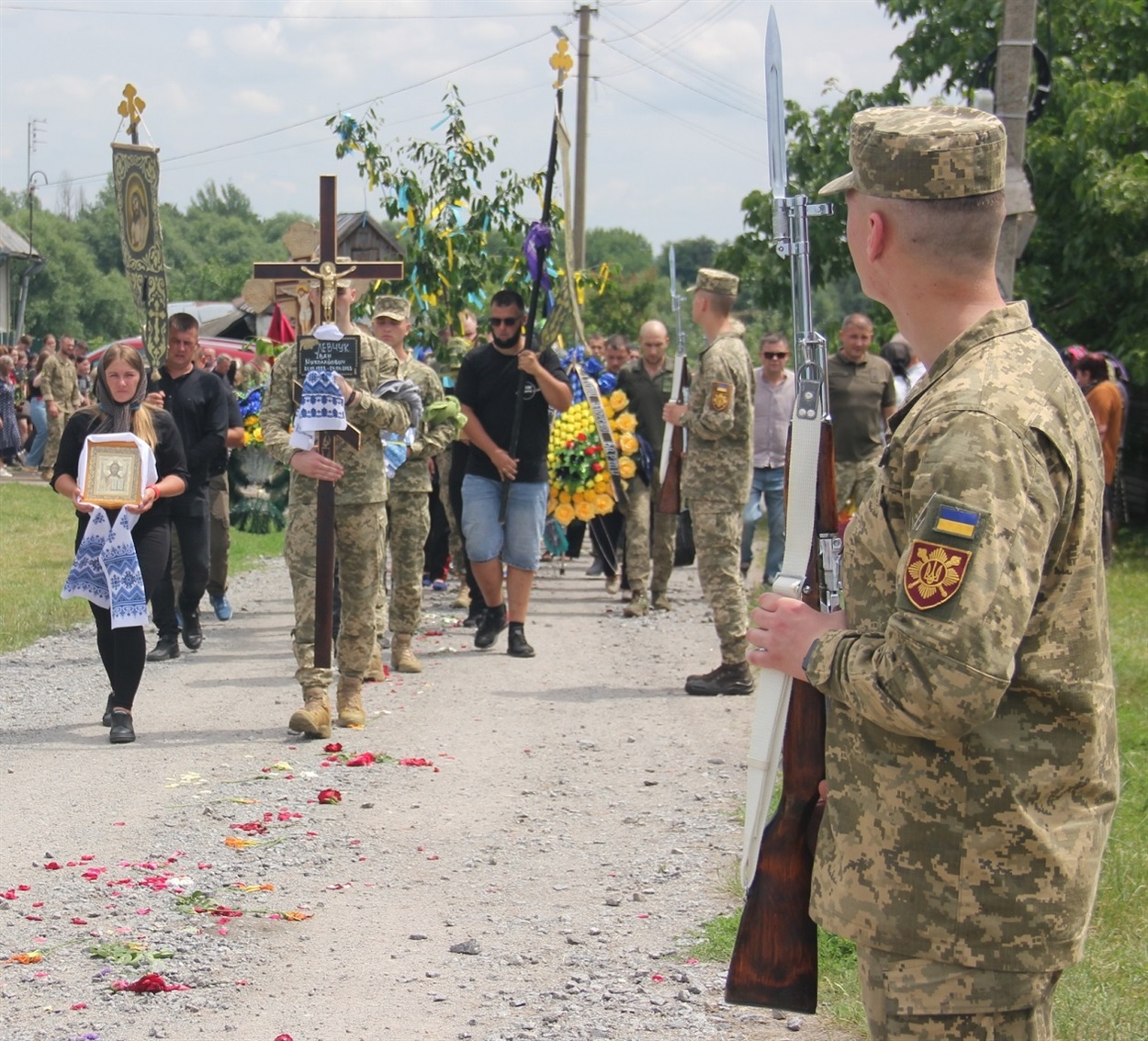 Іван ще не встиг одружитися, створити власну сім’ю, а тому за народним звичаєм його хоронять як нареченого - з гільцем, весільним короваєм - а ще як воїна - військові несуть малинового берета і знамено, підрозділу, у якому служив Іван.