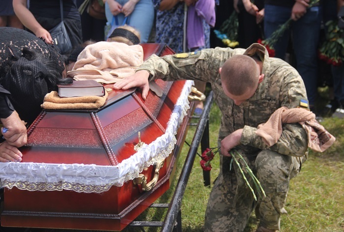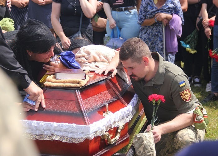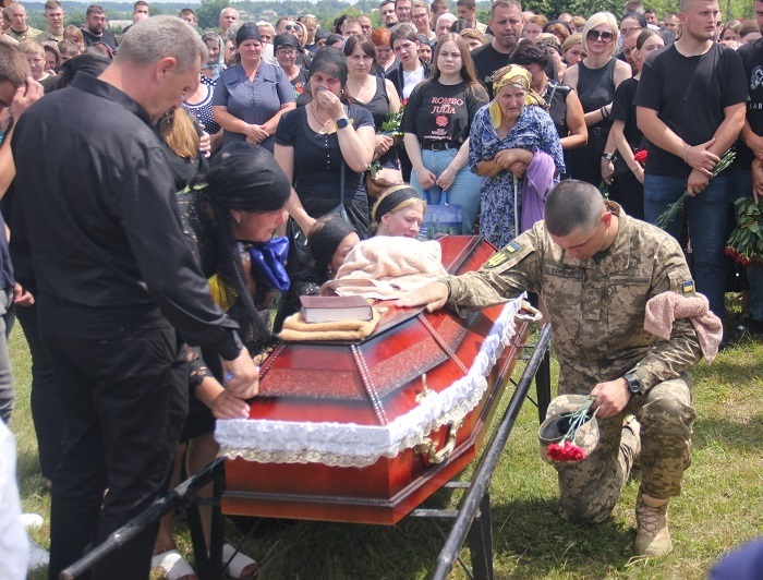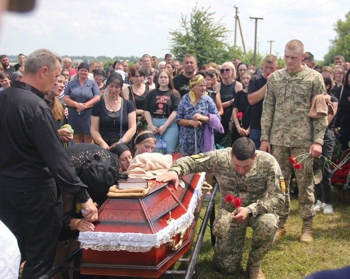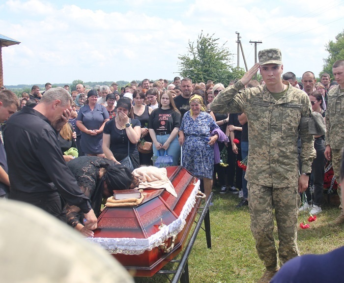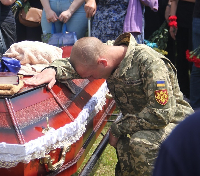 Не стримують емоцій навіть військові. Кожен з них припадає на коліно перед домовиною з тілом Івана, хтось щось тихенько шепоче, хтось поплескує долонею по віку, ніби плескає по плечу свого друга, а хтось, не соромлячись, плаче.