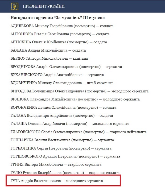 У січні нинішнього року указом президента України за особисту мужність, виявлену у захисті державного суверенітету та територіальної цілісності України, самовіддане виконання військового обов’язку Андрія Гута нагородили орденом «За мужність» ІІІ ступеня.