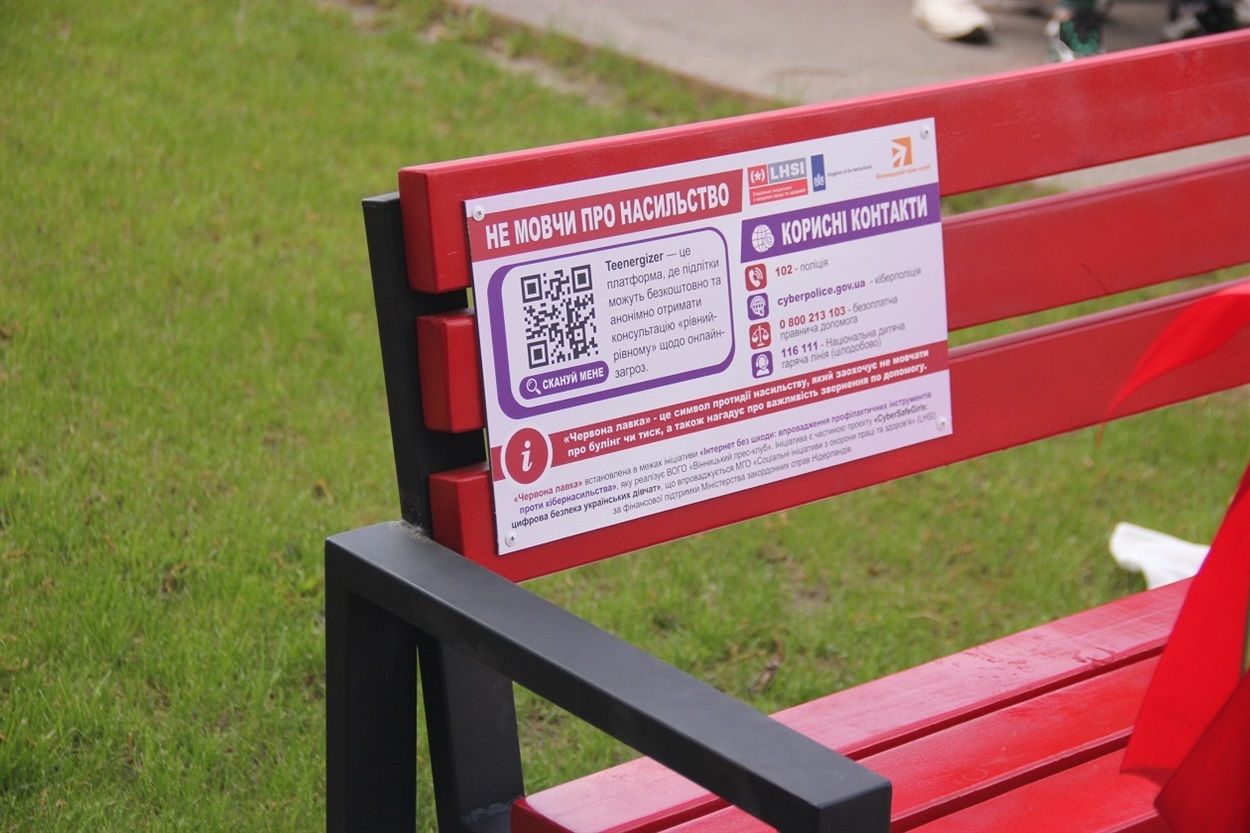 На «червоній лавці», що знаходиться на території Калинівського технологічного коледжу, прикріпили інформаційну табличку. Тут є посилання на платформу анонімної психологічної підтримки для підлітків Teenergizer, де підлітки можуть розповісти про свої проблеми, а також тут є контакти поліції, кіберполіції та національної дитячої гарячої лінії, куди слід звертатися, якщо ви стали жертвою або свідком насильства.