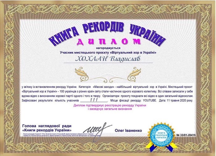 Калинівчанин Владислав Хохлан потрапив до «Книги рекордів України» як учасники мистецького проекту «Віртуальний хор України».